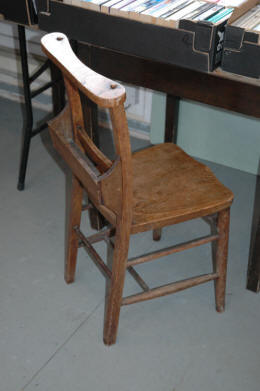 The dry parts were taken to the framing sheds for assembly. Tops and stays were first assembled and glued. Next two back feet were marked for boring and mortising, the boring was done with brace and bit to take the laths below the seat. The mortises were done with chisel and mallet to take the stays and top. The backs after being glued and nailed, went to the Framers for final assembly. Four men worked in the framing shed, each having his own bench and "block'", the latter a solid lump of tree trunk, about five feet long and three wide, levelled on top to make a flat working surface. Next to be made were the fronts. Two forelegs, one "Pig" and two or four "lists", according to the pattern being made, were needed. A back was laid on the block and bored to take the lists and mortised for the seat. The front and back were glued together and the chair was ready to be seated. The chair was placed on the block, the tops of the forefeet rubbed with chalk and a seat laid on and firmly tapped to get chalk marks where the holes were to go to take the legs. The bottom was glued and nailed into place and the chair tested to make sure it stood level. The glue used was heated in an oven in the drying stove, in which the men also heated their cans of tea for the morning and afternoon tea-breaks. At break time the smokers went into the road to light-up, no smoking was allowed anywhere on the Firm, the fire risk with wooden tarred sheds being very great. The men sat on the bank or field fence opposite for their smoke.