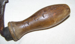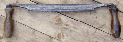 After the parts had been sawn to shape they went to the Benchmen to be smoothed and finished. The tools used for this were Plane, Spoke shave, Scraper and Sandpaper. The finished parts were stacked on outdoor drying racks for a month or so, then taken to the drying-stove to finish off before being used. The test for dryness was to tap two parts together, dry wood gave a different sound from damp. The seats were made by the "bottomers" , the name for a seat being a bottom. The slab of elm, cut to the size of the seat, was shaped by a bow-saw. It was then put between blocks on the shed floor and wedged firmly. The slab was then hollowed with an "adze". This was a skilled job as too much or too little being removed would produce a misshapen seat. The man stood astride in front of the seat and swung the adze towards him between his legs. Having thus obtained the shape the bottom was finished on the bench with spoke shave, scraper and sandpaper. The round parts, Fore-feet "Pigs" and "Lists" were made by the Turner. They worked in a long earth-floored shod , half of which was open fronted, facing the yard where the logs were unloaded. The tools used by the Turners were, Cross-cut saw, Beetle and Wedges, Axes of various sizes, Draw-horse and shave, Pole-lathe and Chisels. The Turners cut the logs into suitable lengths with the Cross-cut saw. The bark was removed by scraping with the small axe. 'Then the log, about eighteen inches or two feet high, according to the type of "leg" required, was placed on a low chopping-block and split into sections, fat or thin as required for the "leg" to be made. The split was made along the grain of the wood, using Beetle and wedges. These sections were rough and angular. They were stacked beside another chopping-block, this one of a convenient height for the man to work without bending. With his small axe he took off all the edges getting the leg almost round. It was further smoothed with the Draw Shave.