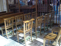 [ Look in "Complete Church Furnishers" and Part 1 of the 1907 Catalogue on the "West & Collier Catalogues" page in the left hand menu for some more examples of carving ] West and Colliers' chairs went all over the world. I have a book kept by my Father, a record of the Churches and Cathedrals seated with Frieth chairs. Last year my sister visited. Norwich and Llandaff Cathedrals and found. the Frieth chairs still in use. Canterbury, Salisbury, St. Giles, Edinburgh, Wells and. Winchester are some of the Cathedrals which had Frieth chairs. There are also 850 still in use in Westminster Abbey. Many overseas Churches and Cathedrals had West and Collier chairs. Johannesburg, Khartoum, Sierre Leone, Newfoundland had them. The largest order for abroad went to the new Anglican Cathedral in Washington D.C. They had 3000, these were sent by instalments as the building progressed and was ready for seating. West and Collier supplied the chairs for the Lambeth Conferences. Each Bishop had his own chair, an armchair, which he took home at the end of the Conference. The factory closed. in 1940. The war made it difficult to get timber. It was also not possible for a small factory, doing mostly handwork to compete with the increasing mass production methods. When I visit a church I look for Frieth chairs, it is a great joy to find some and to look for the framer's mark on the back of the seat. Each man had his own mark, J.J., Jimmy Janes, R. H., Robert Higgs, A.A., Arthur Austin and a tiny circle with a cross in it, Arthur Brown, to mention a few. Peggy West 1969 [ Peggy's words have inspired me to do the same whenever I go into a church during my travels. Click here to see some of the results ] |