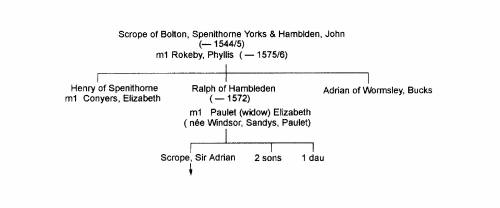 The Scropes of Bolton had been Lords of the Manor of Hambleden from the mid 15th C and their relatives lived at the Manor House at least from 1489 when Ralph Scrope became Rector. The first Manor House is the property now named Kenricks, the present 'new' Manor House was built by Emmanuel Scrope in 1603. Described below are two memorials in the church showing connections with Elizabeth née Windsor. On the south wall of the tower is a memorial to Raffe Scrope, brother to the Lord of the Manor bearing this inscription :