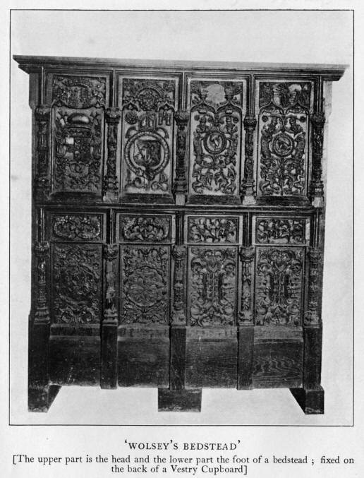 When William Sandys altered and beautified the Vyne, he had the Oak Gallery panelled from floor to ceiling with rows of linenfold panels interspersed with the arms, crests, badges and initials of his family, friends and associates. These include Henry VIII and Katharine of Aragon, Wolsey, Foxe, Tunstall Bishop of London, Warham Archbishop of Canterbury, Sandys, Bray, Brocus, DeVere, Sir William Essex, Foster, Hungerford, Neville, Paulet, Power, Manners and others, as well as fanciful devices and carved heads of men and women. The panelling was probably fitted after 1515 when Wolsey was made Cardinal and before 1528 when Bishop Foxe died and Wolsey was losing favour. This would appear to establish the date of the Hambleden screen for the same reasons. The carvings on the Wolsey screen bear a striking resemblance to those in the Oak Gallery and the oak chimney piece now in the Tapestry room (the Chute family arms were inserted later). Mr Muirhead drew the illustrations for Chaloner Chute's book 'A History of the Vyne' and it was his opinion that the Hambleden screen came from the Vyne via Elizabeth Windsor's marriages. However this style of carving was by no means only to be found at the Vyne, both Henry VIII and Wolsey favoured Italian workers and artists in wood and stone; courtiers and noblemen strove to emulate the work to be found in the king's palaces. Mr W R D Harrison who having made a detailed study of all the carvings at the Vyne and produced an informed and scholarly catalogue of the woodwork in the Oak Gallery says, 'In my view, for what it is worth, there is nothing heraldic or stylistic to suggest that the Wolsey bedhead originated from the Vyne. If it did there would almost certainly be a Sandys' shield on it. I would expect the key to it to lie in the 'shield' below Wolsey's shield on the bedhead. I have tried to identify it but cannot. Apart from the mystery ‘shield’ I would have expected the bedhead to have originated from Hampton Court or one of Wolsey's other palaces, perhaps it was one of the spoils of his downfall, merely being retained as a souvenir at its last location'. Chaloner Chute states that an Inventory of furnishings etc. at the Vyne was made in 1541 (after Sir William's death) and was left by his daughter in law and executrix, Thomas Sandys wife, with her father Lord Roos. Lord Roos was the ancestor of the Duke of Rutland and the inventory was found among papers at Belvoir Castle in 1888. Chute says of the Vyne 'the principal reception rooms were at that time, used as sleeping chambers for important guests, and contained magnificent bedsteads'. Unfortunately an examination of a full copy of the 1541 inventory, now in the Winchester Records Office, neither proved nor disproved the existence of the Wolsey bedstead at the Vyne, as the descriptions of the beds are not detailed enough, but some of them do mention carving. In the Tudor period daughters were often married off with more consideration for their marriage portions and prospects than their feelings in the matter. In the case of Elizabeth Windsor, she could have been genuinely grieved by the death of Henry as, after another two marriages, she set up a memorial to him at Hambleden. Beds were among the most important articles of furniture in Tudor household and the marriage bed was usually considered to be the property of the widow, so is it beyond the bounds of possibility that Elizabeth would take with her, as part of her dower settlement, a very handsome bed when she left the Vyne for Crondall in about 1552, and again when she married for the third time and moved to Hambleden in about 1559. Crondall There is one other slight possibility for the origin or circuitous history of the Wolsey bedhead, and this concerns a Crondall-Wolsey connection. When Thomas Wolsey was a young man he was 'uncanonically married' to Joanne Larke, daughter of Peter Larke 'gentleman of Huntingdonshire and Citizen of London', and by her had two children a son and daughter. Later Joane Larke was legally married to George Legh of Adlington in Cheshire. Records show that Wolsey kept in touch with the Legh family. George Legh died on 12th June 1529 and his widow Joane was soon married to George Paulet of Crondall in Basingstoke Hundred. Joane, née Larke, bore George Paulet two children, but died shortly afterwards. George Paulet married secondly Barbara Hampden and thirdly Elizabeth relict of Henry Sandys. Was the Wolsey bedhead already at Crondall? Perhaps the pseudo 'coat of arms' should be read as 'semee of larks and trefoils on lozenges'. Perhaps Wolsey had the bedhead carved for Joan Larke and devised spurious arms for her, since her father probably was not of sufficient rank to have any. Maybe it was Joan who brought the bedhead with her when she became wife to George Paulet, whose third wife was Elizabeth, née Windsor. So far there is no evidence for this, it is merely speculation both on the coincidence of her name and the birds on the pseudo 'coat of arms'. Conclusion It would appear most likely that it was Rev H C Ridley Rector of Hambleden who purchased the Wolsey screen at the sale of effects at the Manor House Hambleden in 1815 and had it placed in Hambleden Church. That the screen had been part of the furniture of Hambleden manor house since Elizabeth brought it with her from Crondall (where it was already?) or from the Vyne when she left as Henry Sandys' widow seems a feasible explanation. How the Wolsey bedhead came to be at the Vyne, Crondall or elsewhere is unclear. The bedhead seems very likely to have belonged to or been commissioned by Cardinal Wolsey at some time, or maybe made for his use by one of his associates (or perhaps Wolsey had it made for Joane Larke?) Is the fifth panel a rebus and does it hold the key to the origin of this elaborate piece of carving? That the Hambleden Wolsey altar/screen/bedhead has survived through nearly five centuries in almost perfect condition is a miracle in itself, an