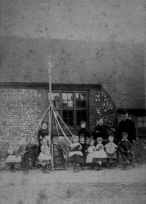 May Day customs and Maying could have been a survival from the distant past, particularly the inclusion of Jack O' the Green Boughs, but it was Tom West who taught the children to dance the Maypole. Probably this was introduced after his years of teaching in Devon. Having read Mr. West's log book and studied his collection of papers and yearly reports, I have been struck by the way in which, over the years, he battled against great difficulties with untrained helpers and very little equipment. He was adaptable to change and he never stopped learning how to teach. He acted on the yearly suggestions of the H.M.Is and widened the curriculum to meet the ever increasing needs of his pupils. In the early years the 'Three Rs' and the Bible were the only subjects taught by Mr. West and much of the learning was by rote. The Diocesan Inspector came once a year to test the pupils on their knowledge of the Bible, church teaching and the Catechism. By 1877 the subjects taught were Reading and English Grammar, Writing, Arithmetic, Scripture, Object Lessons ( a mix of Science, History and Geography), Knitting and Needlework. The latter seems to have been of a functional kind judging by the list of garments made in 1879 : "Plain holland overalls, Flannel petticoats, Coarse aprons, Shifts, Knitted cuffs, socks and stockings, Small drawers" Here are a few extracts from the log books of the period : 1879 : H.M.I. report "More books required" 1880 : Geography and history mentioned 1884 : Singing and note teaching mentioned 1885 : H.M.I. report "The little ones need pictures" 1886 : H.M.I. report "Infants need some manual occupations" 1887 : H.M.I. report "Occupations of the Infants now fair" 1889 : H.M.I. report "Schoolroom is seriously overcrowded" 1890 : Drill mentioned 1892 : "The infants are learning the Maypole in their playtimes" 1893 : H.M.I. report "The kindergarten exercises should be given a wider range and greater variety and used more than they are at present to train the children's powers of observation. Some of the seats in the gallery are too high and the younger children not suitably seated"Musical Drill for the girls and boys mentioned" 1894 : Science lessons and a School 'Museum'