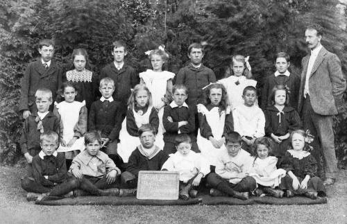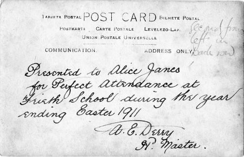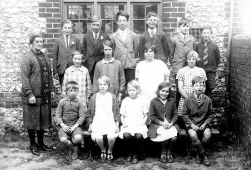 Post war [ WWI of course ] reports tended to be more critical of teaching methods used in the school, but this was a period of countrywide change in education and the HMIs tried to implement the changes. e.g. Phonics were introduced into the teaching of reading, a new Physical Training syllabus was printed, a round script form of writing was favoured instead of cursive (looped). The names of Standard I, II etc. (Note 19) were being dropped and the children grouped in classes. The syllabus for the over 11 year olds was being widened to include technical subjects and selection at 11 years through a competitive examination for free and assisted Grammar School places was introduced (Note 20). Unlike his predecessor, Mr Derry was not a keen sportsman, although he did take football/cricket practice (on Saturdays?). Mr & Mrs Derry were ardent in church work and observance. On Sundays Mr Derry took Sunday School in the schoolroom from 10:00 - 10:30, read a 'suitable' story to the children from 10:30 - 11:00 and then marched them into church from 11:00 - 12:00 unless they produced a written note from their parents to the contrary! Sunday School prizes were given yearly, for good attendance, presumably these were provided by the Church or philanthropic parishioners. Good attendance at school was rewarded by having one's photo taken in a summer group. The pupil's mother was given a copy to keep.