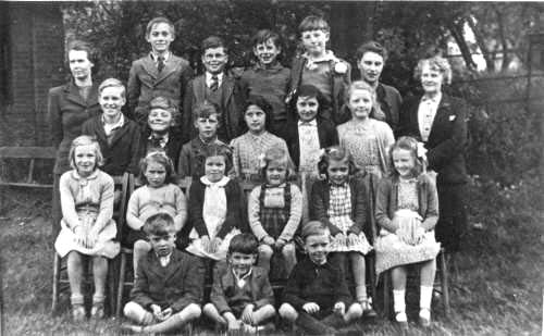 Regular visitors called as before and added to their number were the Canteen Organiser, the Youth Organiser to talk to the school leavers about employment and the School Librarian. In 1949, instead of receiving boxes of books from the Central Library, a library van called and teachers were able to choose the books most suited to their children. The most important change was when Frieth ceased to be solely a Church of England school and became Aided (Note 49). The log book does not record exactly when this change took place, but a note from the Diocesan Inspector records : May 1947 : This School is one that I hope will be able to continue as an Aided School under the 1944 Act, as it makes a valuable contribution to the life of the place. Apart from the usual coughs and colds there is very little reference to illness in Mrs Garrett's records. Immunisation had eliminated diphtheria and the improved water supply and sanitation had almost overcome scarlet fever. School milk and meals ensures that every child was fed. As previously stated, most of the academic most of the academic subjects were treated individually. Mrs Garrett excelled in needlecraft, especially embroidery and knitting. Music was taken by the assistant teacher and most of the PE and games. PE lessons were enlivened by the use of small apparatus, soft balls, hoops and ropes. Both boys and girls joined in playing rounders in the summer and netball in the winter. The boys were allowed to play cricket on the Village Green during the lunch break. Pupils were taken on educational visits : July 1945 : Children taken to the music festival at Marlow Oct 1945 : Twelve children taken to High Wycombe to see the film 'Henry V' [ surely the version starring Laurence Olivier, music by William Walton, 1944, Technicolor ] April 1946 : 19 children taken to see 'Great Expectations' Wycombe Grammar School June 1947 : 9 children taken to the theatre to see 'Twelfth Night' May 1949 : Senior children taken to London to see St Paul's, Tower of London etc July 1950 : Junior School Sports at Loakes Park, High Wycombe Sept 1951 : Whole school visited London Zoo; Mrs Woodhouse paid July 1952 : Senior children taken to visit Westminster Abbey, Buckingham Palace etc National events were recorded in the Log Book and those to do with the Royal Family marked by special prayers or hymns. V.E. day was celebrated by a short ceremony in school followed by the BBC broadcast. Mrs Garrett was one of the first people in the village who was able to have a television set (Note 50). She took older pupils up to her house to see the wedding of Princess Elizabeth [ 20th November 1947 http://www.bbc.co.uk/archive/princesselizabeth/6606.shtml ] and other events of importance or national interest. Various plays and musical items were performed by the children but the production of these was more the province of the assistant teacher. ![]() School photograph from 1949 or 1950